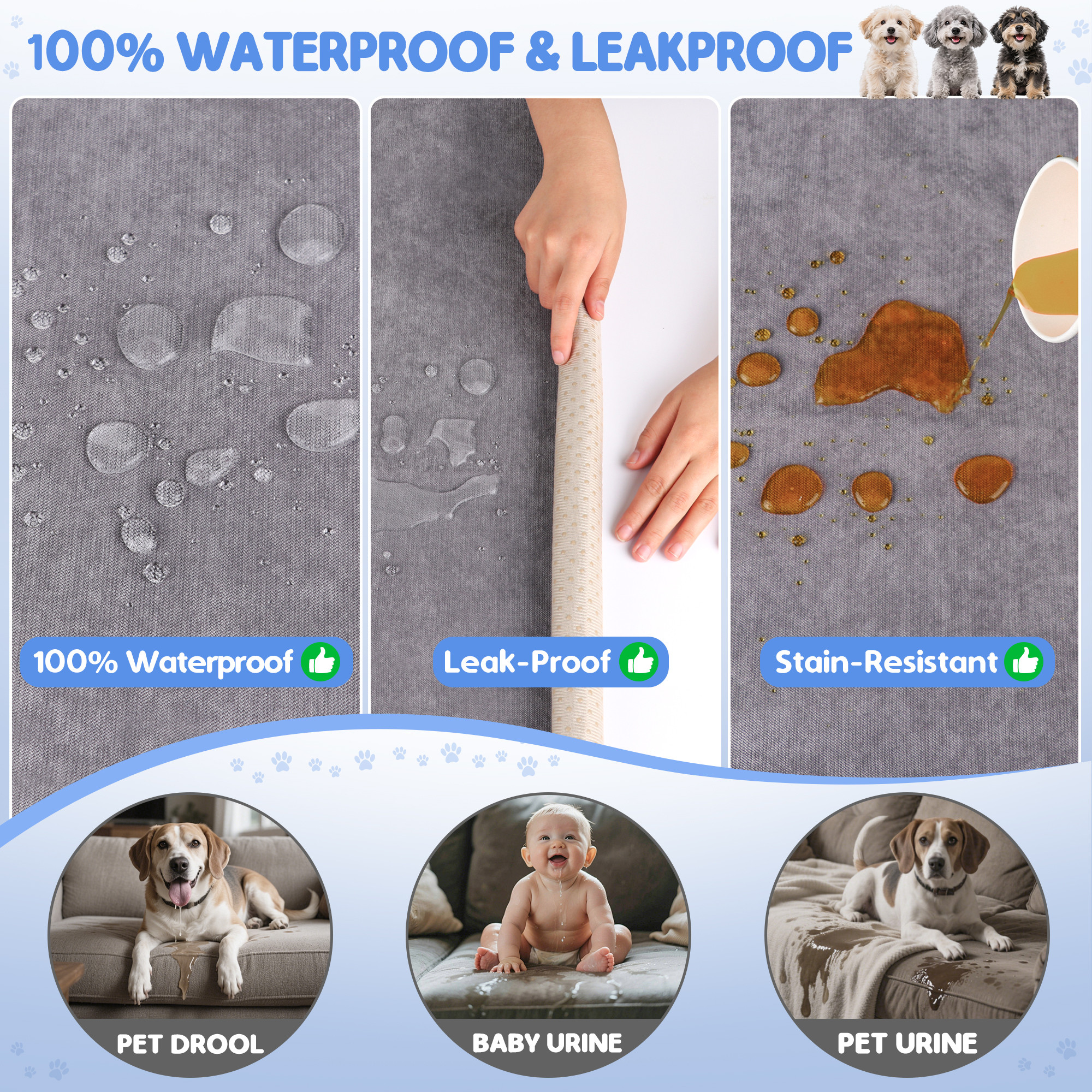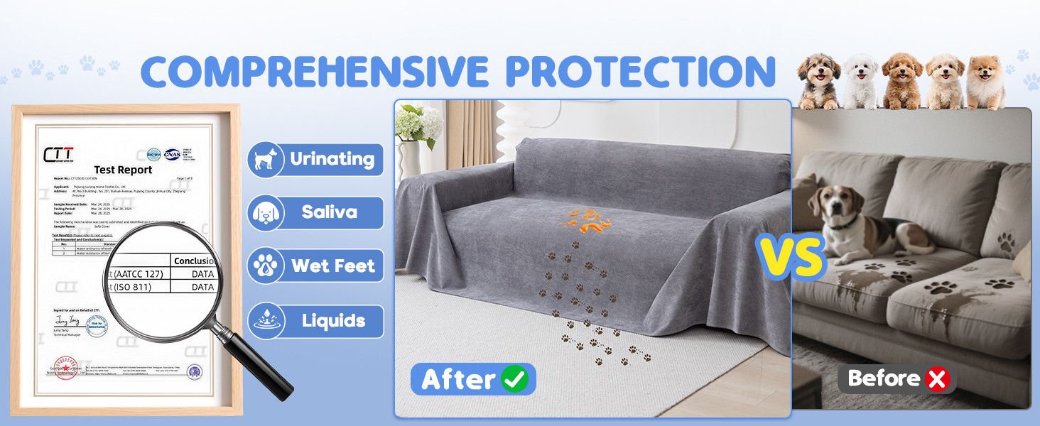 Dual-Sided Waterproof:Our waterproof couch cover was certified by ILAC -Water resistance of textiles: Hydrostatic Pressure test (AATCC 127), waterproof layers on BOTH SIDES lock in accidents, drool, and muddy paws—no more flipping the blanket when spills happen! Lab-tested to stop liquid from soaking through. Let your pup play wild while your couch stays pristine.