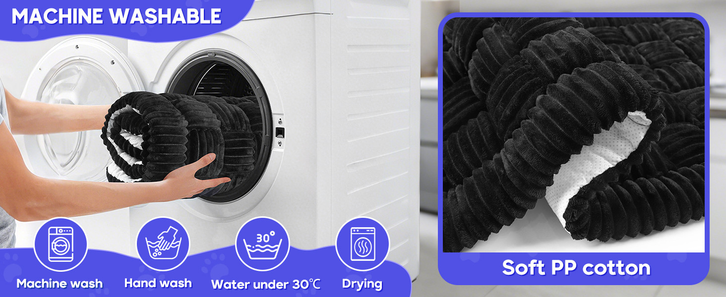 Durable and Easy to Clean:We understand that pet products need to withstand daily wear and tear. That's why this fuzzy dog bed is made of durable materials that can endure your pet's scratching, chewing, and all kinds of daily abrasion. Moreover, it's extremely easy to clean: just toss it in the washing machine with cold water (about 30°C) and gentle detergent, no bleach needed! For drying, keep the temp below 40°C—no ironing required. When the mat gets dirty, this hassle-free care routine lets it quickly return to a clean, tidy state, saving you time and effort.